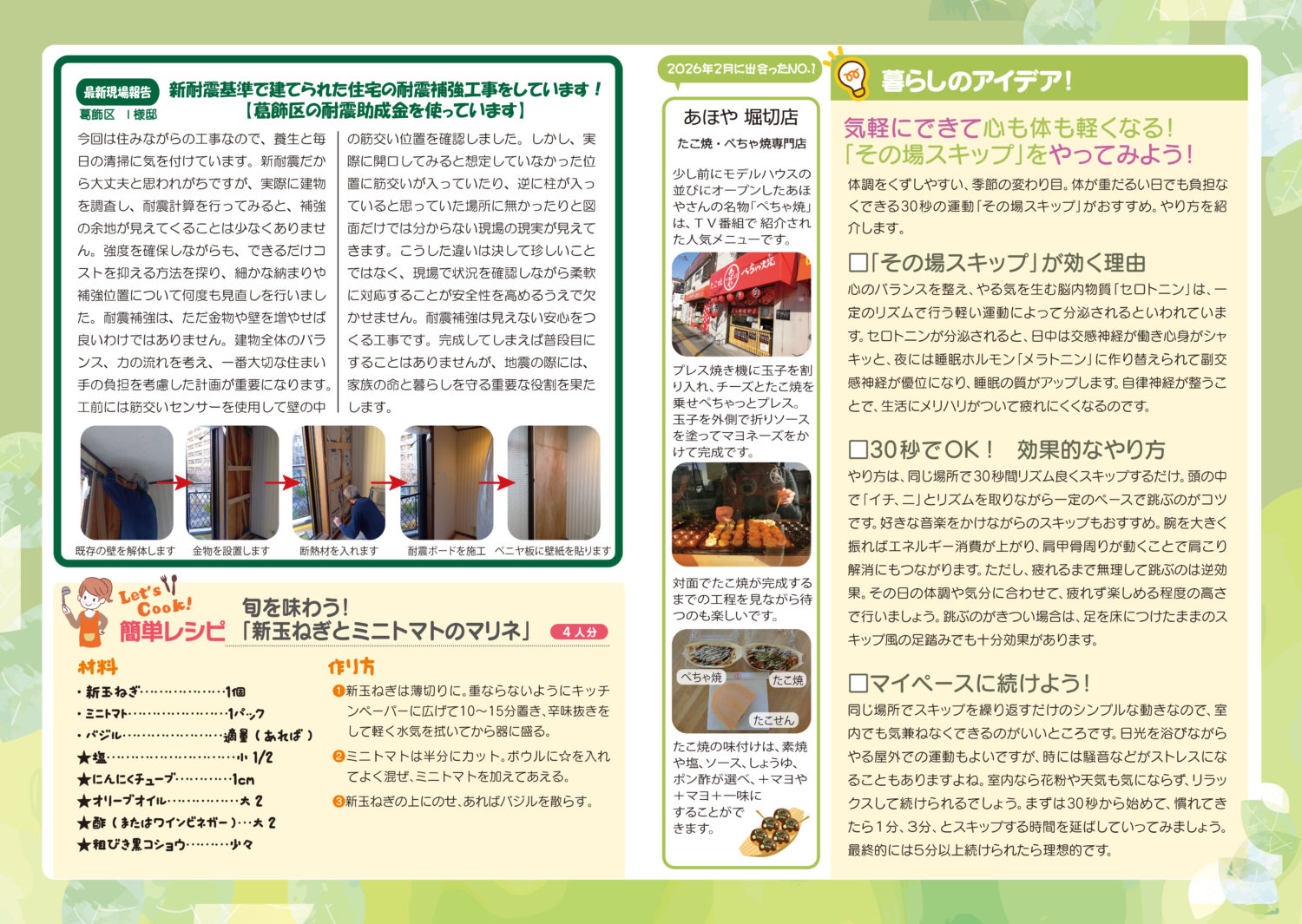 ・宝探し気分!ハウスで味わう甘い完熟イチゴ(真っ赤なイチゴを摘みたてでパクリ) ・最新現場報告 木造二階建ての新築工事をしています(葛飾区)完成に向けて工事が進んでいます ・最新現場報告 新耐震基準で建てられた住宅の耐震補強工事をしています!(葛飾区の耐震助成金を使っています) ・簡単レシピ(旬を味わう!新玉ねぎとミニトマトのマリネ) ・2026年2月に出会ったNO.1 (あほや 堀切店 )~たこ焼き・ぺちゃ焼き専門店~・暮らしのアイデア(気軽にできて心も体も軽くなる!「その場スキップ」をやってみよう!)
